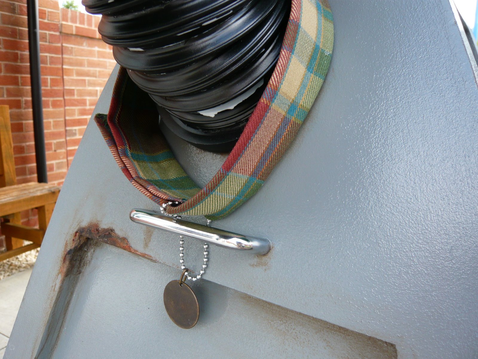 I am constantly adding new features and re working the elctrical system, The old neck as been repainted, this time with paint that will not crack and fall of. The water spray system is now fitted but not working yet unit I get my Wireless RF switch. K9 now has a new collar and tag as well.