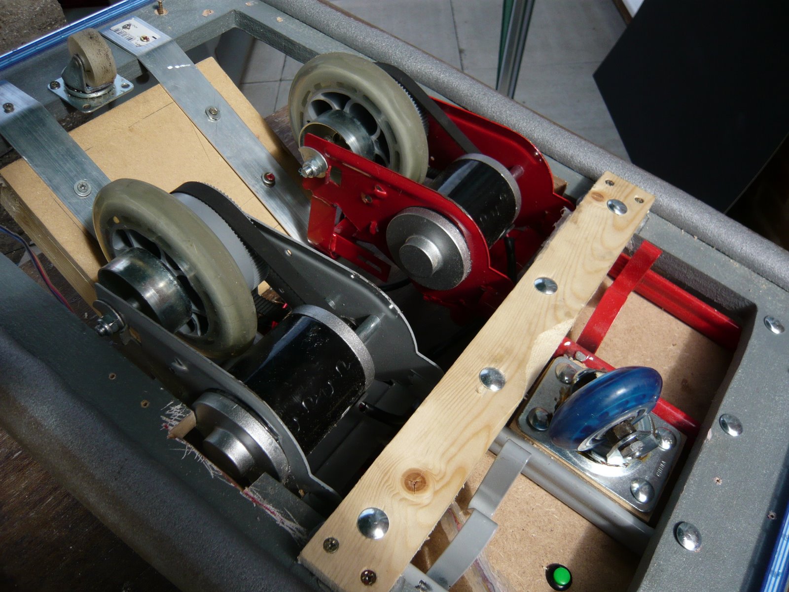This is my final drive tray and it works brilliantly. I have moved the drive wheels not to the back but just of center, slightly to the rear, with a larger leading caster. I have added a rear caster but it rides just of the ground, more like a wheelie wheel. The batteries have been placed behing the drive wheels and lower keeping the center of gravity very low, stopping tipping .It took a while to get it all balanced and set up correctly but it works so much better. With the drive wheels effectively in the center the turning looks more natural and it is certainly much easier to control. I do have the dreaded front caster problems in that it will not go over rough ground but the compromise was worth it in terms of driveability.