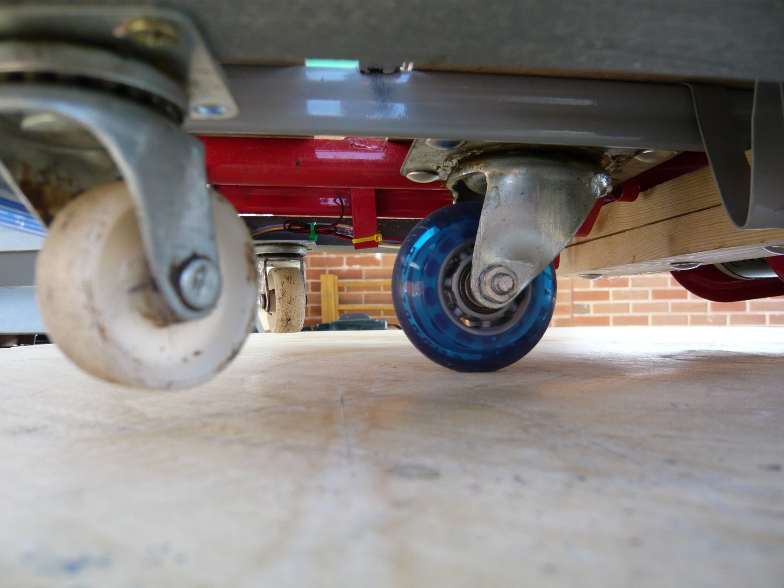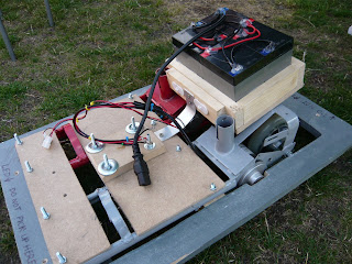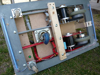 The plan was for the drive system was to have the drive wheels at the front allowing K9 to be able to move over rough ground however after buildinbg this drive tray with the drive wheels at the front and the caster at the back getting K9 to run in a straight line was almost impossible. Even though I had spent loads of time building this drive tray I have decided to change the design and put the drive wheels at the back. I will lose the ability to move over rough ground but to be honest if I dont chage the design I will spend more time repairing K9 due to crashing due to poor control.