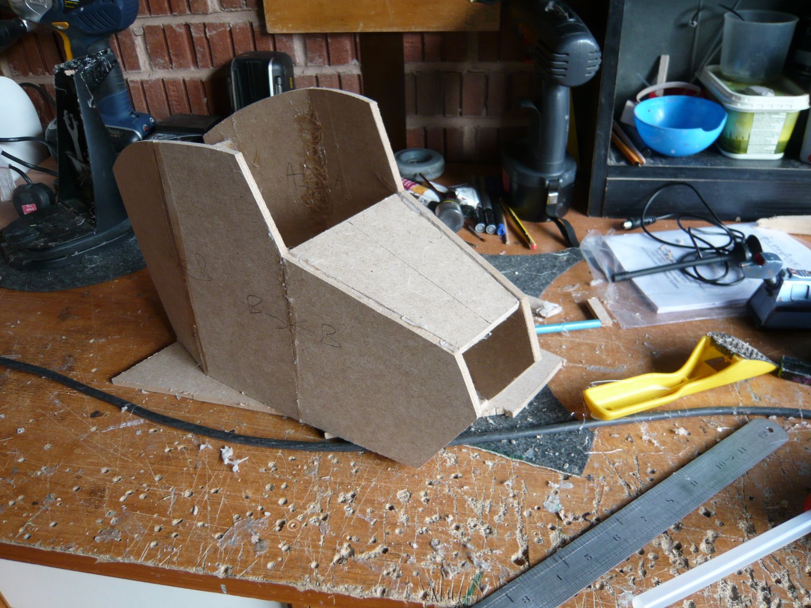 Again the measurements for the head where very hard to find and when I did find them they were very hard to read. For refernce I had downloaded loads of head pictures and virtually every one looked slightly different. The shape I decided on certainly looks the best although at the moment it does look a bit fat.It is made from 6mm MDF again and glued with hot glue. Each sections is added creating the curve. The surface will eventually be filled and sanded so it will look completely smooth.
