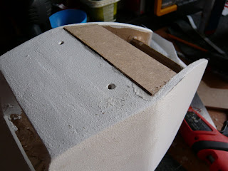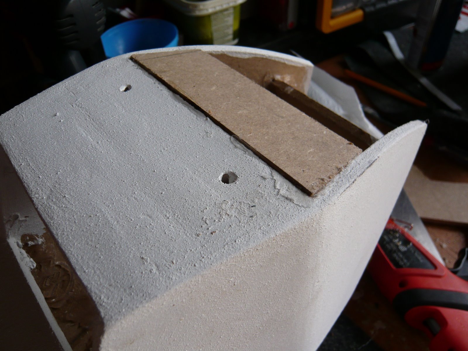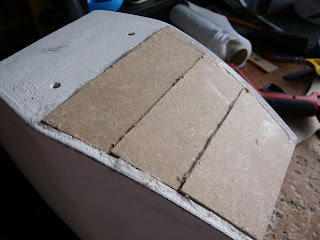 A bit more work adding the curve to the top of the head, just more 6mm bits of MDF all glued in place with hot glue. Once filled and sanded it will give me a perfect curve to the top of the head. I test fitted the neck and it seems to work, now it just needs spraying mat black.