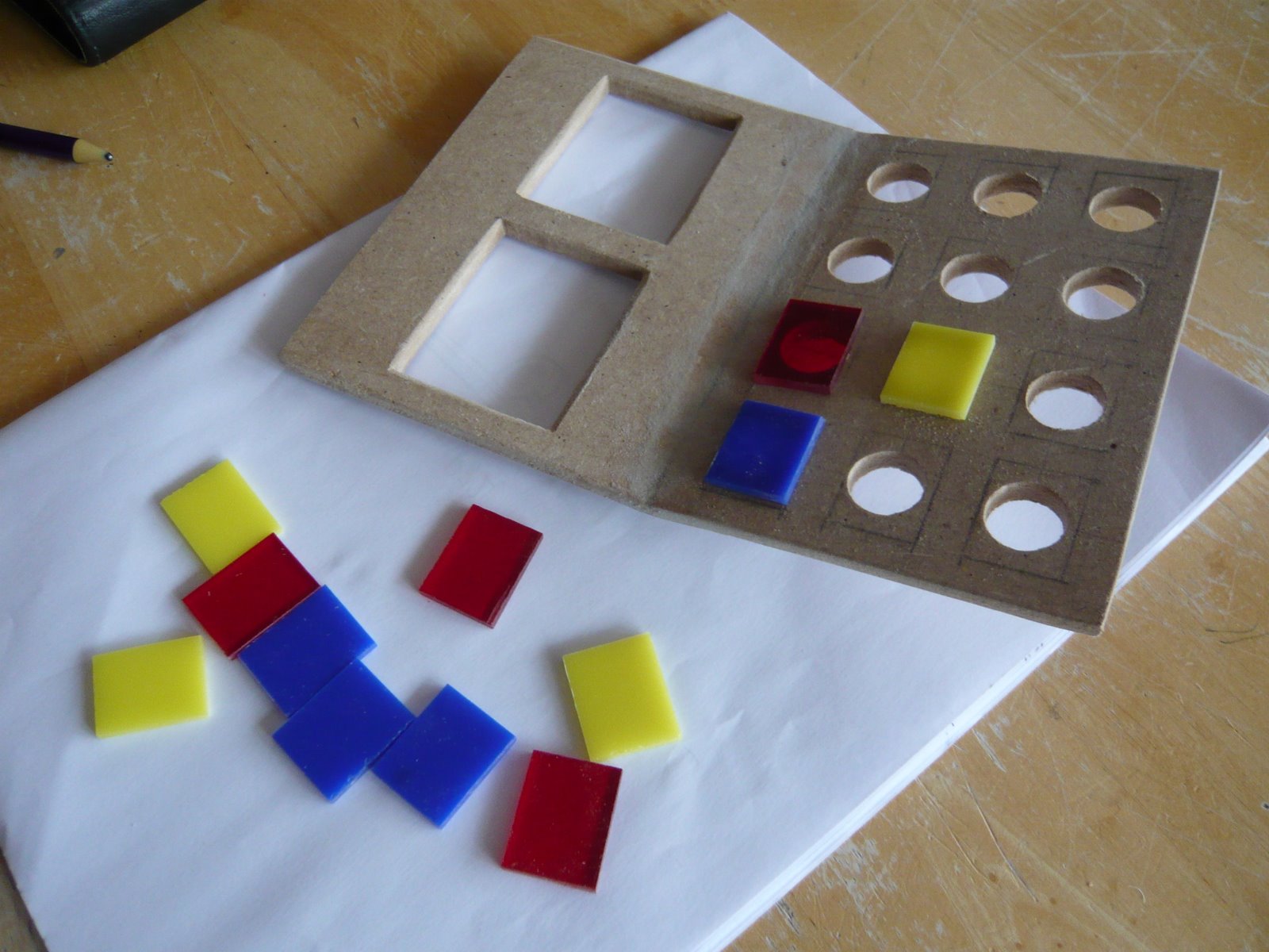 I got hold of some thin see through coloured perspex and simply cut out 25x20mm squares for the switches which are just stuck in place. I will eventually place LED's under each switch and it will flash away.