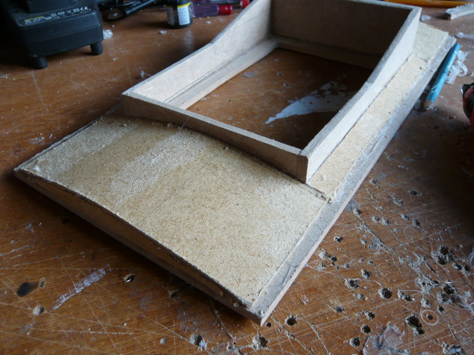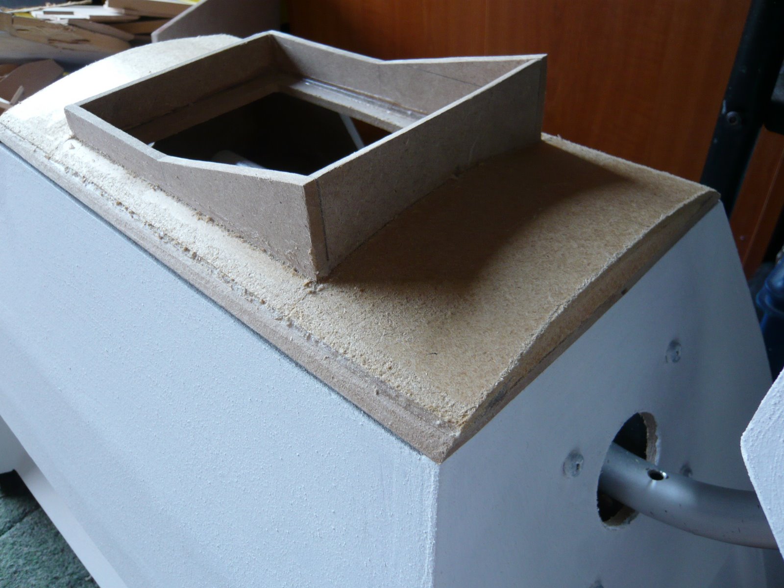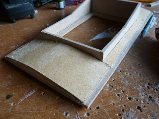 I have started work on the top panel. I initally made the ,ower part flat and added the curve with thin hardboard. I did it like this because the whole top panel will be removable to give access to the head motors. The top panel will have the flashing lights set into fake switches and I may add a small LCD display to show the battery state.