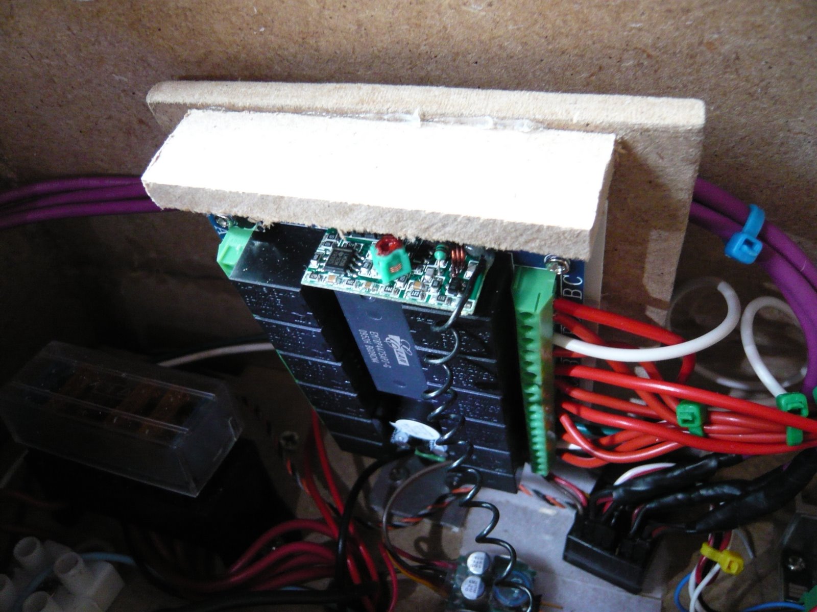The Compressed air system is very simple and this time I have mounted it on the lower tray so once the upper body is removed everything is easy to get to. I have used the same trigger system as on the R6 which is the can fixed to a piece of MDF via an metal band. The band can be tightened to hold the can but easily opened up to replace the can when needed. The trigger is a door hinge, linked to a car central locking solenoid via a metal rod. Once 12v is applied to the solenoid the rod pulls the hinge which presses down on the can spray head. The air is routed up through tubes into K9's nose. To remotely apply 12v to the solenoid the power is supplied via the RF switch so I can trigger it all remotely.