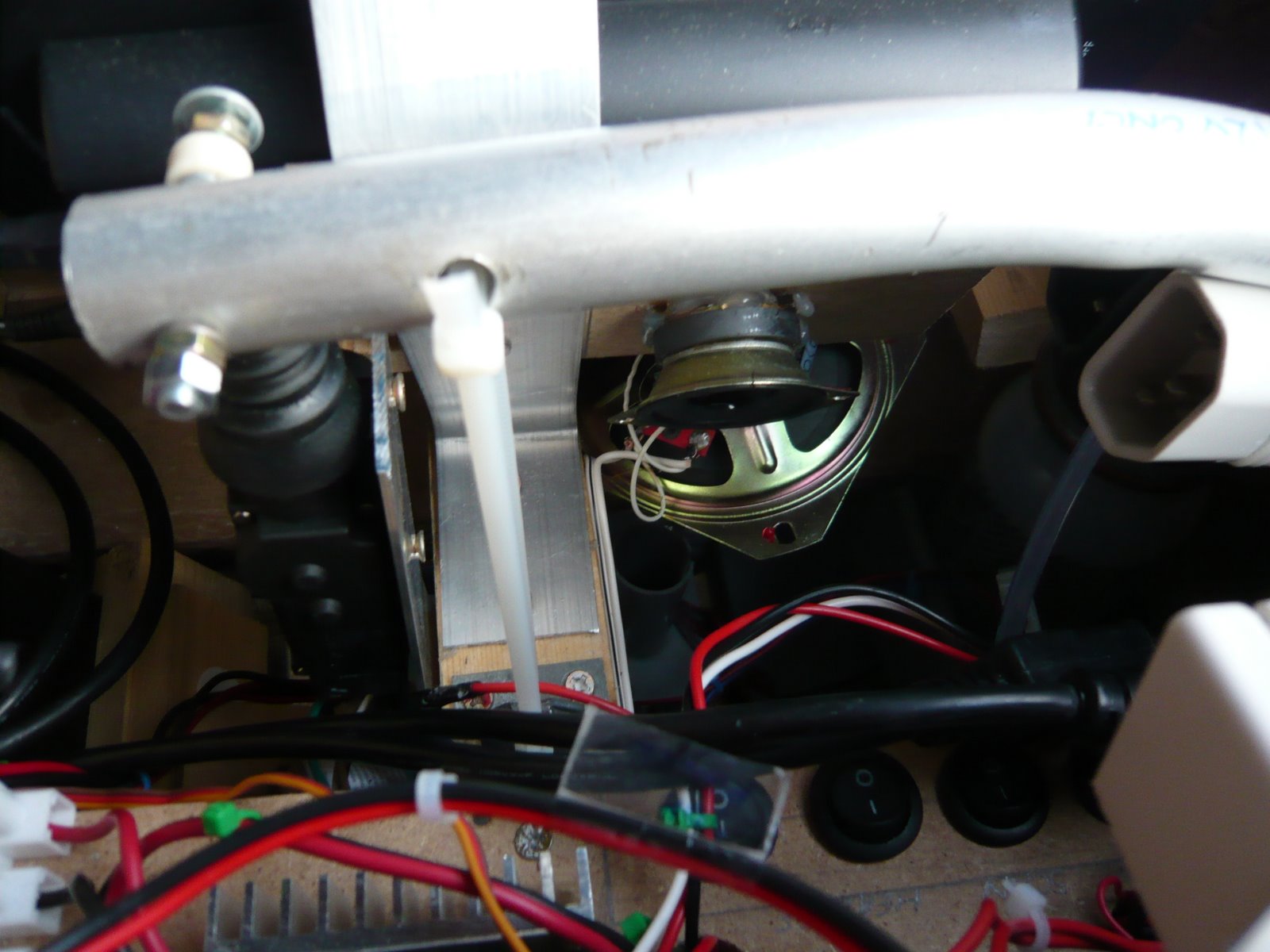 I have added a small amplifier to give the sound system a bit of a boost, after the last event it was clear that I needed more volume. The hardest thing was placing the speakers due to the fact that I am slowly running out of space. You can just about see one of the speakers in the picture, the other is mounted below the power board.