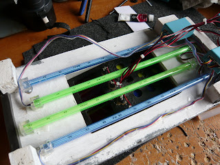 The top panel lights are a very simple solution but add a nice touch. I decided to use four LED strips. Each strip can be controlled and made to flash in one of eight patterns. The greeen buttons change the flashing rate and preset pattern. I have added the green buttons after whatching the kids trying to press the buttons on the top panel at the last event. Now they can press the greeen buttons and the light patterns will change.