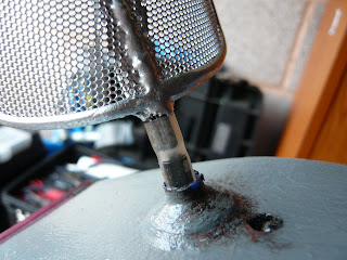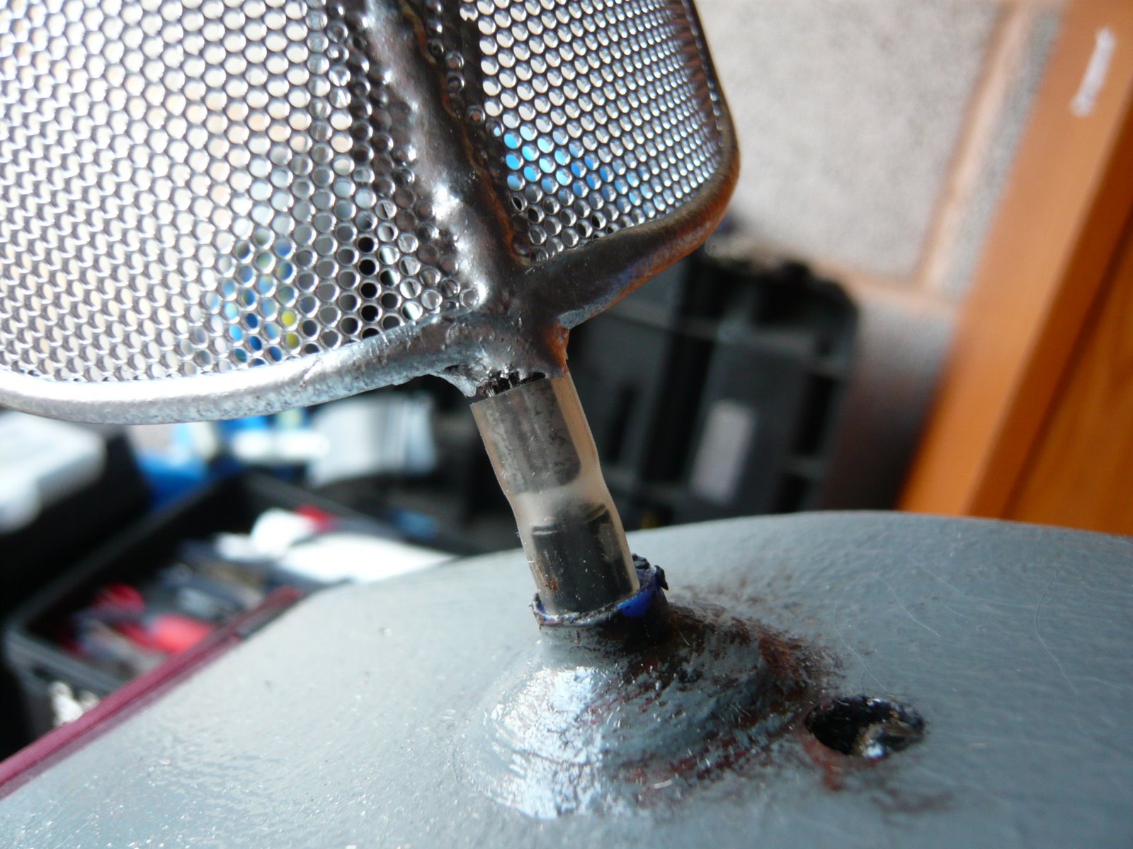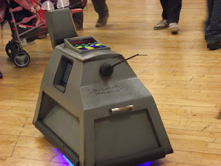 Apart from a better sound system need on K9 what was essential was stronger ears and tail. After several events where the ears have been torn of I have to come up with a solution that would allow the ears to survive the attention of hords of children. The problem is that everyone wants to pat K9's head and in the process either accidentally pull of the ears or bend then casuing the stem to snap. The solution was very simple, although it took ages to work out. To keep the ears intact I fitted small flexible tubes between the ears and the drive rod coming out of the head. This allows the ears to be very roughly treated, bent flat onto the head or knocked but then spring back into shape and they still function perfectly. The tail mechanism was treaded in a similar way. You can see in the picture a white spring loaded mechanism attached to the servo which takes up any shock loads if the tail is pulled or knocked sharply sideways against the pull of the servo. The tail has also been modified to allow it to be pulled fully out of the gator holding it so if it is pulled violently it will simply pull out and not damage any of the emchanism driving it.