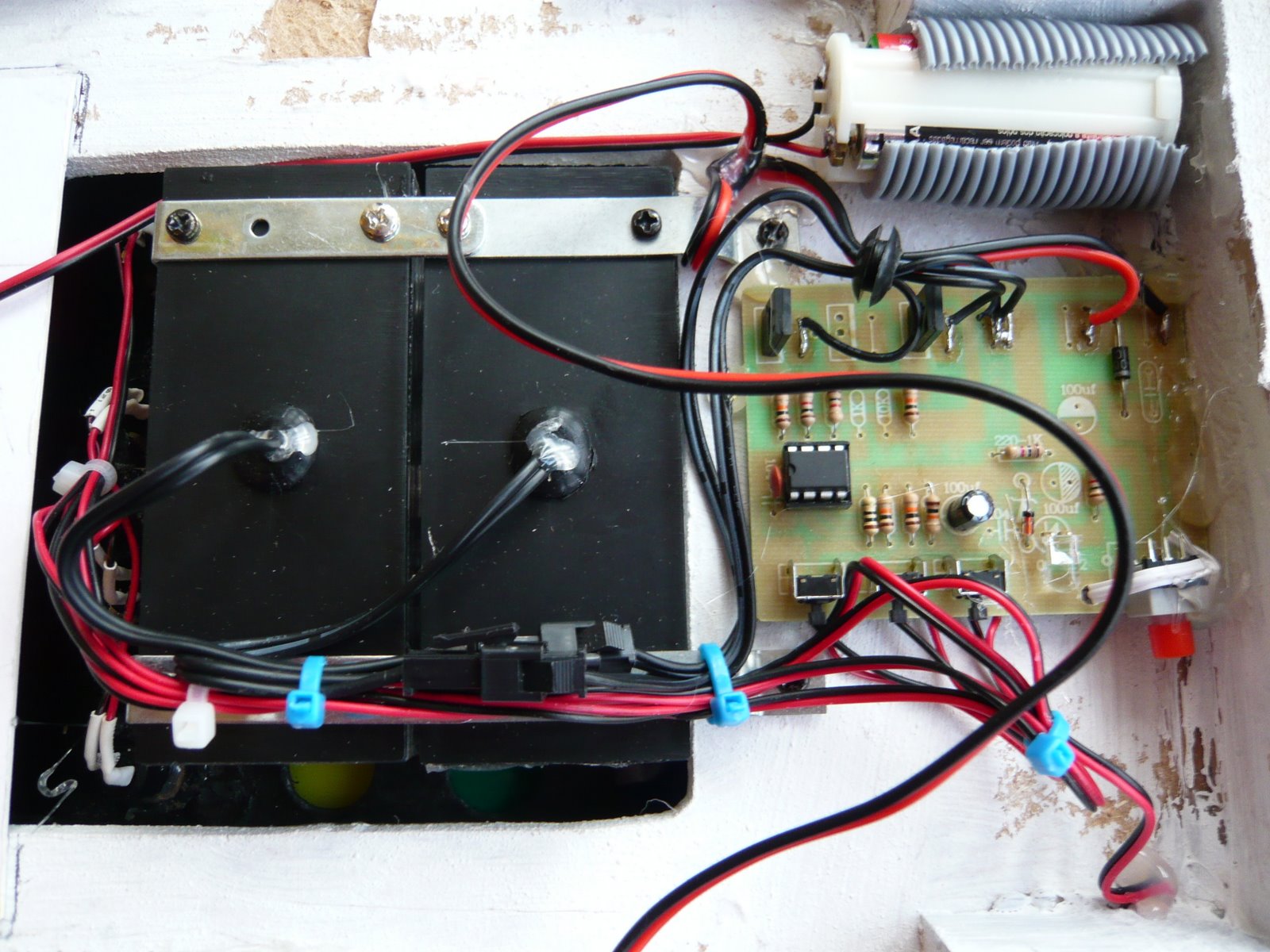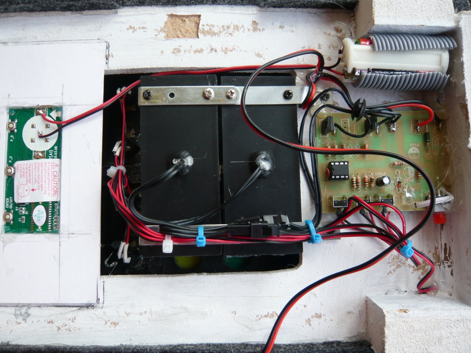 I originally fitted flashing neon tubes under the top pannel to give the illusion of the moving switch lights but these have now been replaced with much better and more advance units. The two strobe blocks are powered by a small circuit that randomly flashes the lights. The preset pattern can be over ridden by pressing the round green buttons. At event kids like pushing the buttons on the top pannel so by pressing the green ones they can effect the light real time.In the larger red window there is a scrolling LED screen showing what ever I wish. It currently shows, K9 and hsi Blog address.Have a look at the video below to see it all working.