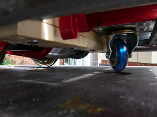 This is my final drive tray and it works brilliantly. I have moved the drive wheels not to the back but just of center, slightly to the rear, with a larger leading caster. I have added a rear caster but it rides just of the ground, more like a wheelie wheel. The batteries have been placed behing the drive wheels and lower keeping the center of gravity very low, stopping tipping .It took a while to get it all balanced and set up correctly but it works so much better. With the drive wheels effectively in the center the turning looks more natural and it is certainly much easier to control. I do have the dreaded front caster problems in that it will not go over rough ground but the compromise was worth it in terms of driveability.