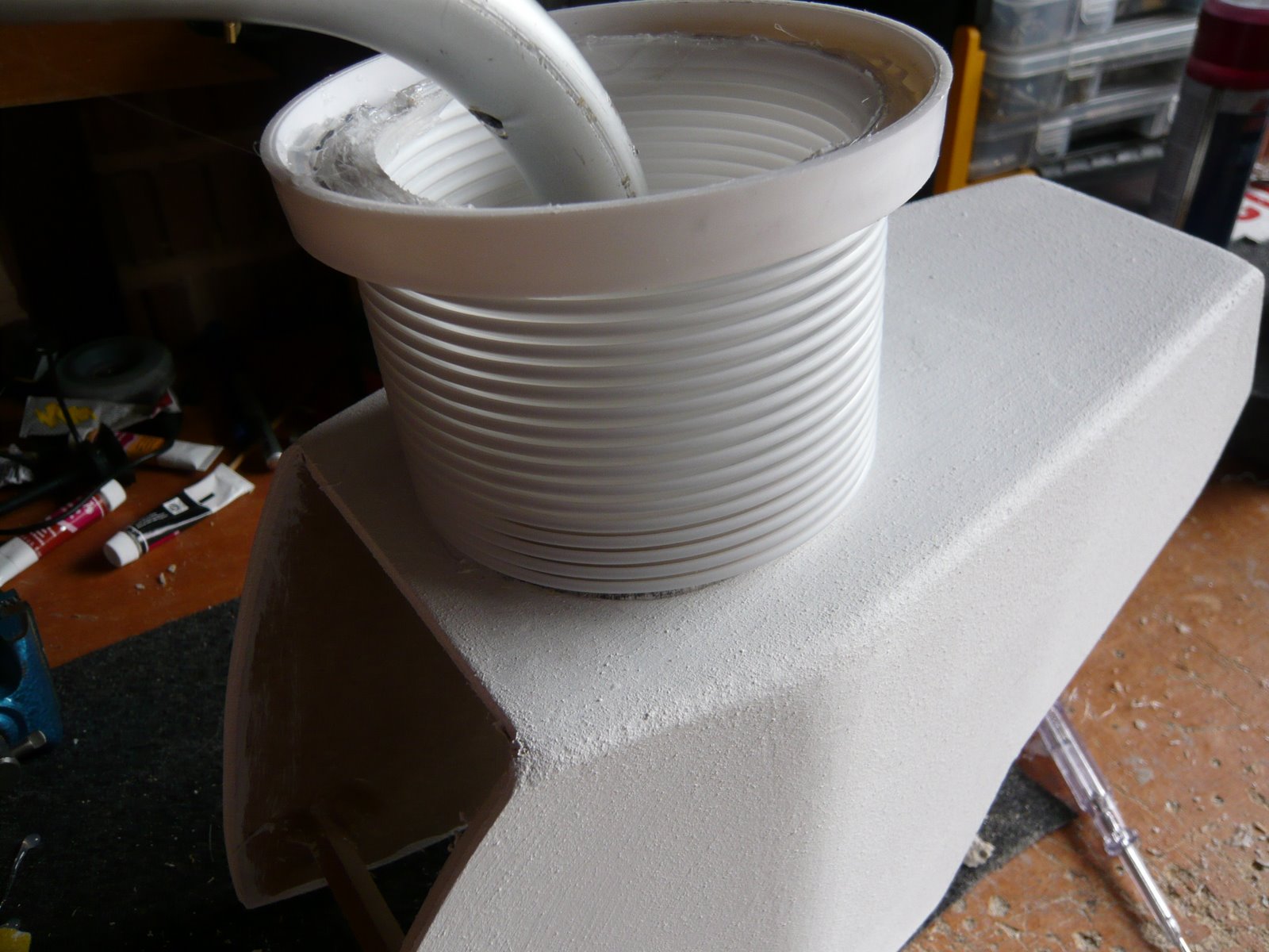 The neck tube was a pain to find but eventually I found this flexible tubing from Wicks, which seems to look the part. I have glued collars onto the body and head and the neck tube will eventually be glued to each of these. I am hopeing it will be flexible enough to allow the head to move freely although at this time I have not worked out how I am going to do this. The head movement will need a serious motor to drive it as it is starting to get quite heavy. I think I will drop the idea of the head moving side to side as it will add even more weight.