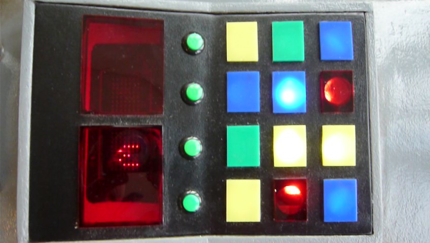 I originally fitted flashing neon tubes under the top pannel to give the illusion of the moving switch lights but these have now been replaced with much better and more advance units. The two strobe blocks are powered by a small circuit that randomly flashes the lights. The preset pattern can be over ridden by pressing the round green buttons. At event kids like pushing the buttons on the top pannel so by pressing the green ones they can effect the light real time.In the larger red window there is a scrolling LED screen showing what ever I wish. It currently shows, K9 and hsi Blog address.Have a look at the video below to see it all working.